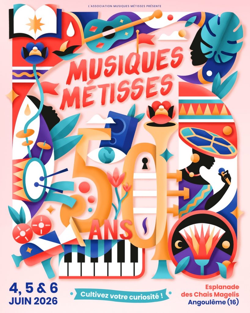 50E FESTIVAL MUSIQUES MÉTISSES ESPLANADE DES CHAIS MAGELIS – ANGOULÊME 4, 5 & 6 JUIN 2026 Cinquante ans ! Un demi-siècle de musiques, de voix, d’histoires et de rencontres. Cinquante ans à faire battre le cœur d’Angoulême au rythme du monde. Cinquante ans de curiosité indomptable. Depuis 1976, Musiques Métisses trace sa route, libre et […]